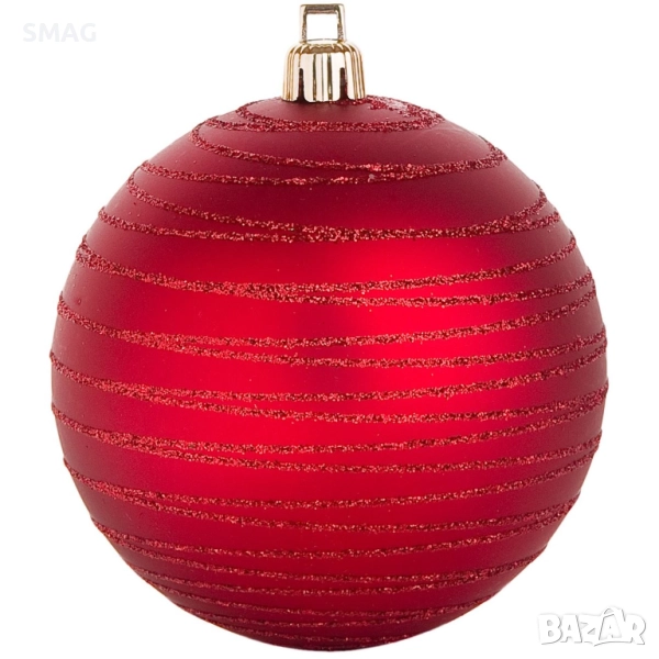 Комплект от 6 червени коледни топки с релефни райета, матови и декорирани с брокат. Перфектен избор за празнична елха с класически и стилен вид.