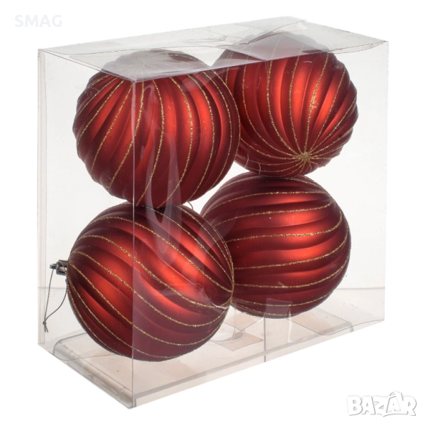 Червени матови топки с вълнообразен дизайн и златист брокат придават празничен и елегантен вид на елхата. Подходящи за създаване на стилни коледни аранжировки и комбиниране с други украси за уникална декорация. Идеален избор за домашна елха или празнични композиции.