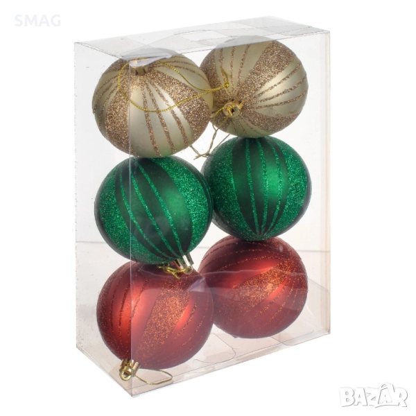 Коледни топки в шампанено, зелено и червено с брокатени райета, подходящи за елха и празнични декорации. Добавят елегантен блясък и празнично настроение на всяко пространство. Идеални за комбиниране с други украшения за завършена коледна визия.