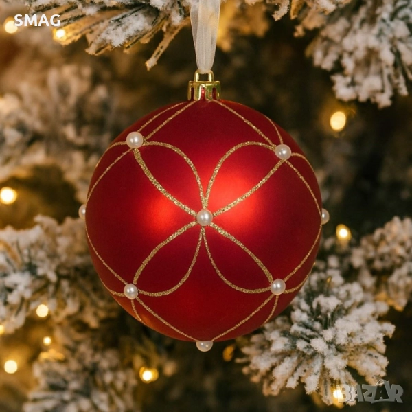 Елегантна коледна топка в червен матов цвят с изящни златисти брокатени орнаменти и бели перли. Подходяща за украса на елха, създава празнична и топла атмосфера у дома или в офиса. Идеална за добавяне на стил и традиционен коледен дух.