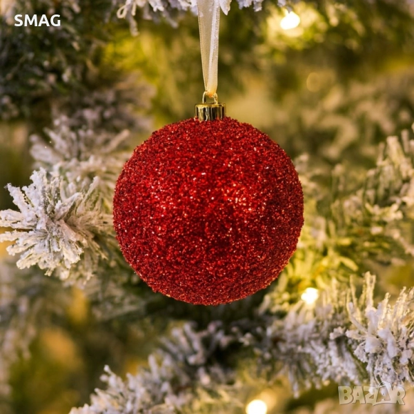 Класическа коледна топка в червен цвят с декоративен тънсел, създаваща празнично настроение. Подходяща за украса на елха, гирлянди или коледни композиции, добавя елегантен и традиционен акцент. Идеална за дом, детска стая или офис пространство.