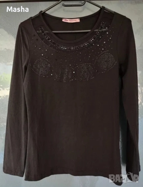 Блуза с декорации в размер S/M, използвана, цвят - черен. Носена може би два пъти, като нова. Декоративните елементи са завършени.