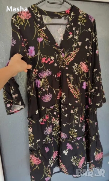 Черна рокля с флорален десен от Vero Moda. Носена два пъти, практически нова. 100% вискоза. Размер 38 M на етикета. 3/4 ръкави.