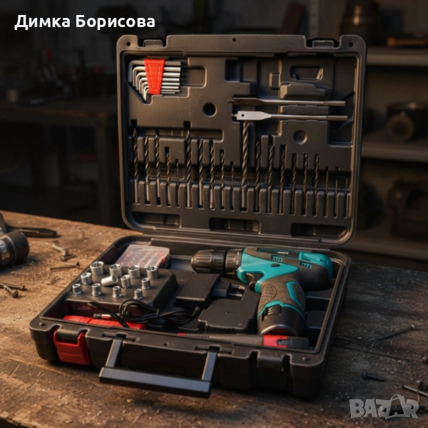 Тип: Акумулаторен винтоверт с пълен комплект аксесоари;