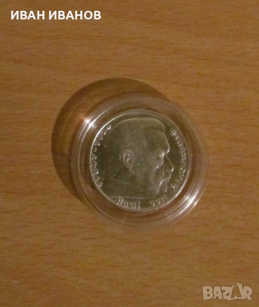 5 марки 1938 година Нацистка Германия (Трети райх). Буква J, монетен двор Хамбург. Продажбата на монетата се извършва единствено с колекционерска цел и не е пропаганда на фашистката идеология.