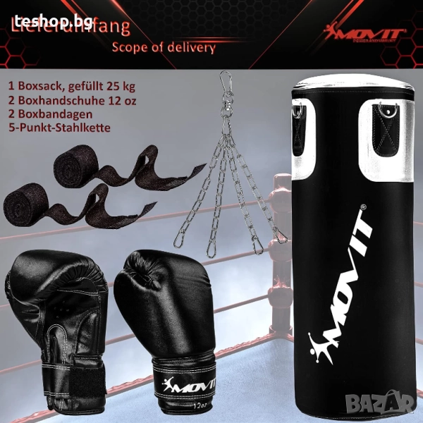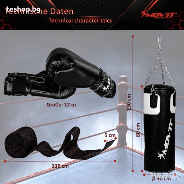 Пакетът включва здрав боксов чувал с височина 80 см и диаметър 30 см, осигуряващ задоволително боксово изживяване. Боксовият чувал се предлага със здрава 5-точкова стоманена верига и карабинер, за да се осигури сигурно закрепване, дори по време на интензивни тренировки. Комплектът боксови чували включва първокласни боксови ръкавици от 12 унции, изработени от висококачествен полиуретан, предлагащи едновременно комфорт и защита. Ръкавиците са с фиксатор за палеца, вътрешна подплата от пяна, дишащи отвори за въздух и удобно закопчаване с велкро за оптимално прилягане.