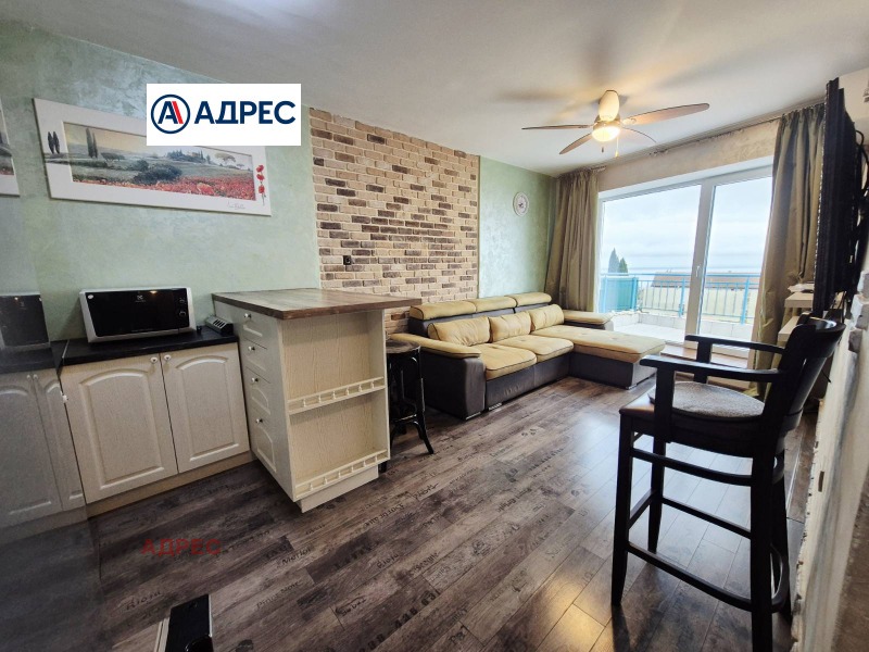 Тристаен апартамент с фронтална морска панорама от всички стаи. Предлага се напълно обзаведен, кокетен и уютен. Разполага с дневна, две спални, санитарен възел, излаз на простотна обща тераса от всички стаи.