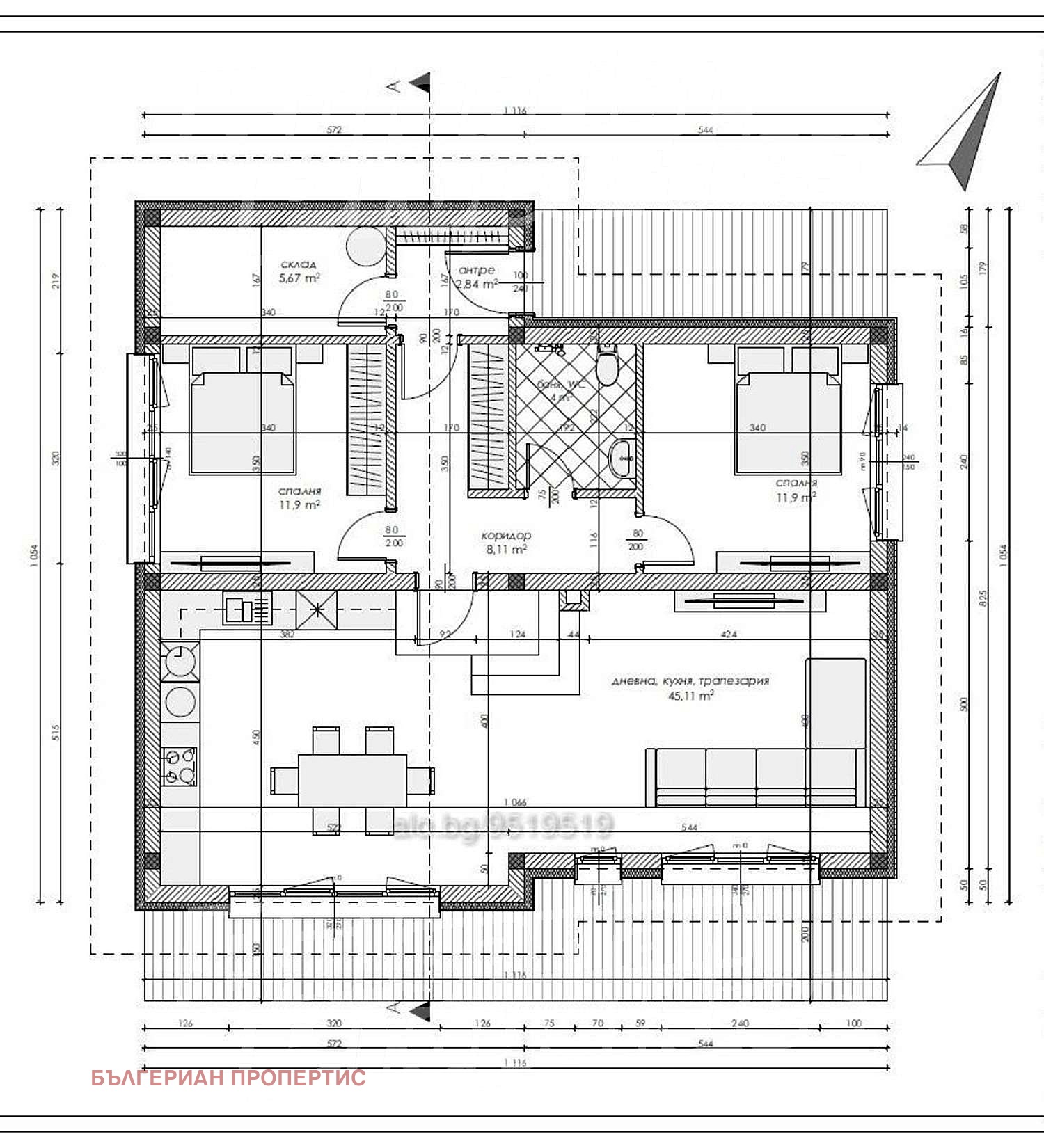 Разпределението включва входно антре, просторна дневна зона с кухненски бокс и трапезария, две спални, баня с тоалетна, сервизно помещение и широка южна веранда, която създава перфектно място за отдих и летни вечери на открито. В дневната има възможност за обособяване на допълнителна трета стая при желание.
