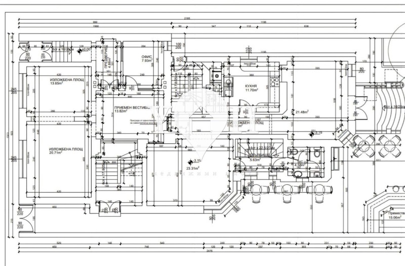 Застроена площ на етажа е 180 кв.м., отделно има складови помещения в сутерена с площ от 60кв.м.