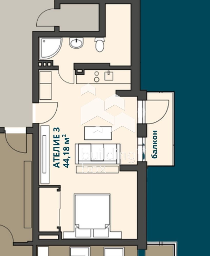 Имотът е с много добро разпределение, със застроена площ от 44,18 кв.м.
