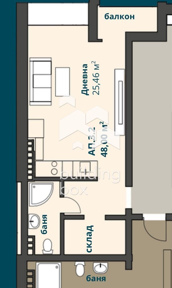 Имотът е с много добро разпределение, със застроена площ от 48 кв.м.