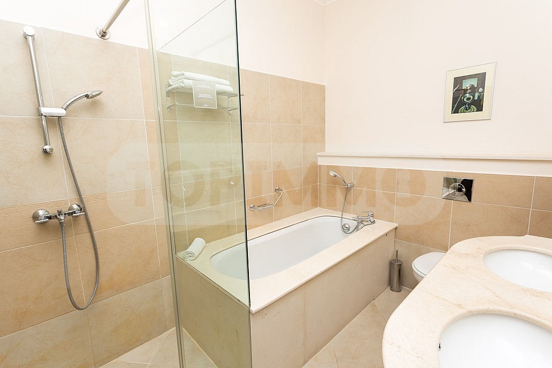 На 103,8 кв.м. са разположени голяма просторна дневна с кухненска част, 1 спални с баня с тоалетна към нея, едната спалня, отделно тоалетна за гости. Разполага с голяма тераса с гледка към морето и към голф игрището. Към апартамента има складово помещение в същата сграда.