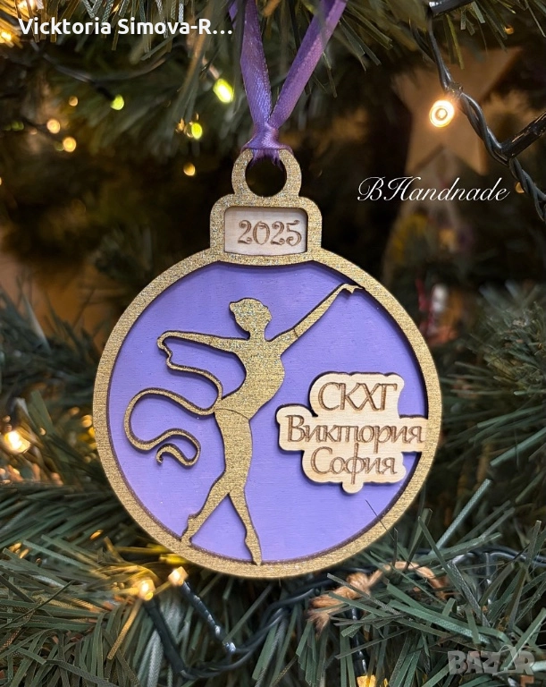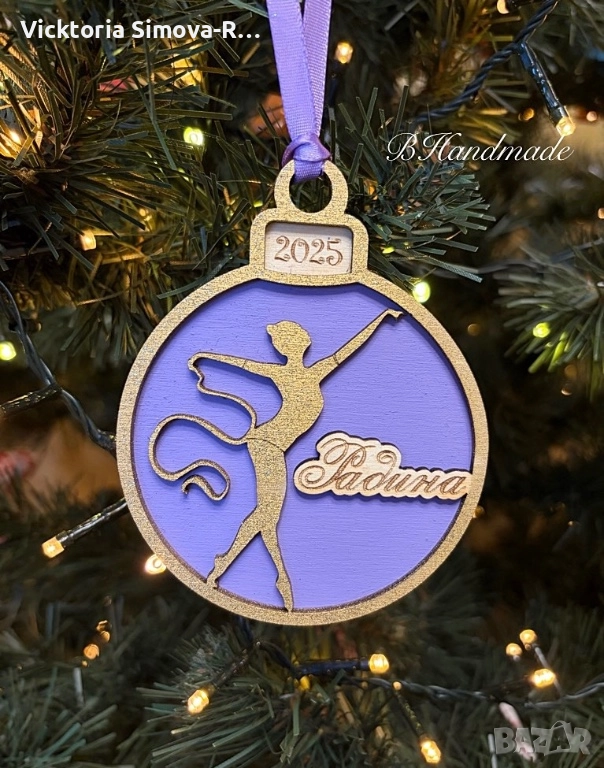 2)Персонализиран, дървен орнамент за елха, на тема художествена гимнастика (фонът отзад може да бъде с цвят по избор, съобразен и със спортния клуб) - 10,50лв. за брой