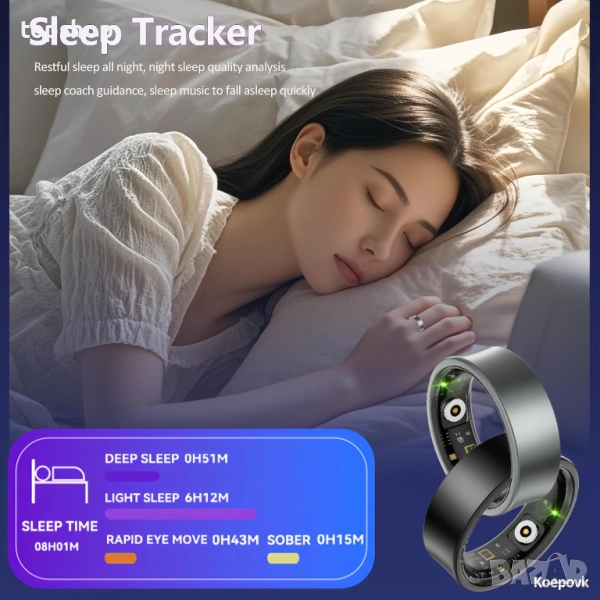 ПАСВА КАТО МЕЧТА: Любимият ви тракер за сън вече е увит около пръста ви - буквално; умният пръстен е толкова удобен, с космически алуминий, че дори няма да го усетите с тегло около 2,5 грама. Докато събира информация за качеството на съня ви, точни алгоритми за сън записват честотата на съня, дълбок и лек сън.