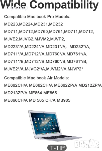 Съвместим с Mac Book Pro (Retina, 13 инча, началото на 2015 г./средата на 2014 г./края на 2013 г./Retina, началото на 2013 г./края на 2012 г.; Съвместим с Mac Pro (13 инча, средата на 2012 г.), Съвместим с Mac Pro (13 инча, края на 2011 г.), Съвместим с Mac Pro (13 инча, началото на 2011 г.), Съвместим с Mac Pro (13 инча, началото на 2011 г.), 13 инча, 13 инча (2011 г.), средата на 2010 г.), съвместим с Mac Pro (13 инча, средата на 2010 г.), съвместим с Mac Pro (13 инча), края на 2009 г.), съвместим с A1435, A1465, A1502.