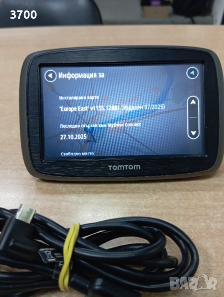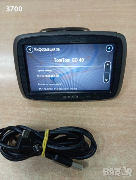 TomTom drive 40 с актуални крти на България и страните от Източна Европа вкл. Германия. Добър външен вид без особени забележки по него. Има Bluetooth и трафик информация през телефон(едва ли се подържа на територията на България). Батерията държи но не е много, някъде 15-ина минути.