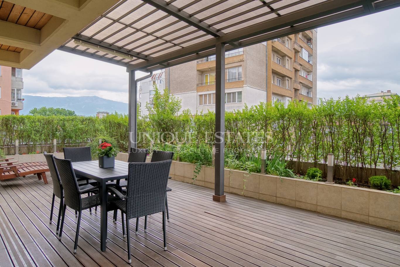 Апартаментът е с изложение югоизток - северозапад и предлага функционално и светло разпределение, което включва просторен хол с трапезария и кухненски бокс, дневна зона с излаз към голяма тераса с озеленена градина, три големи спални, две елегантни бани, едната от които с вана с джакузи и просторно мокро помещение.