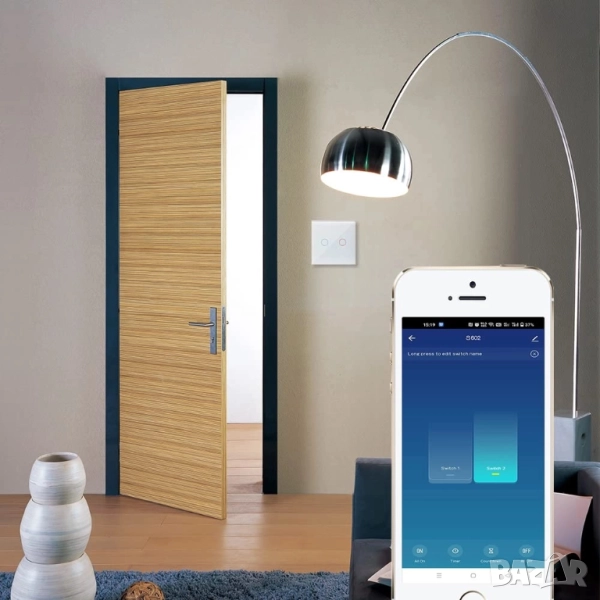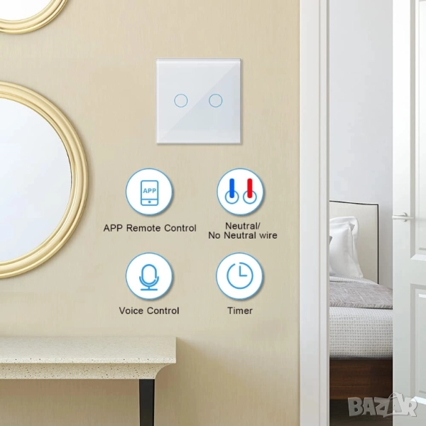 Този интелигентен превключвател за осветление, 2-канален, работи със стандартни LED лампи, лампи с нажежаема жичка и други стандартни осветителни тела с мощност 5~300W. Не е подходящ за LED лампи с по-ниска мощност от 5W.