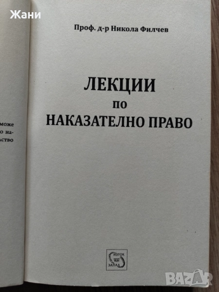 Лекции по наказателно право на проф. Д-р Никола Филчев, издателство Изток--Запад, 2015 г. В много добро състояние.