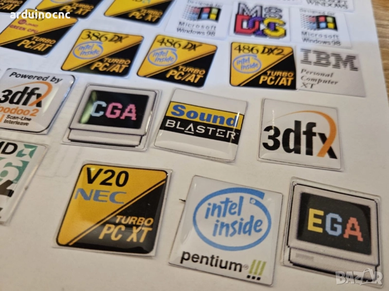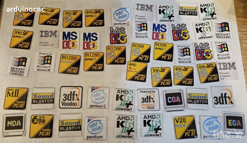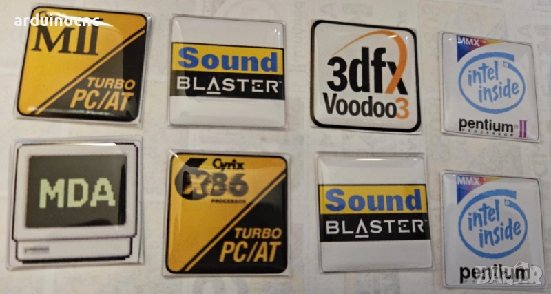 ретро компютър, емблеми, баджове, лепенки, Pentium, 486, Sound Blaster, Voodoo, K6, ретро хардуер, компютърна кутия, реставрация, old school PC,