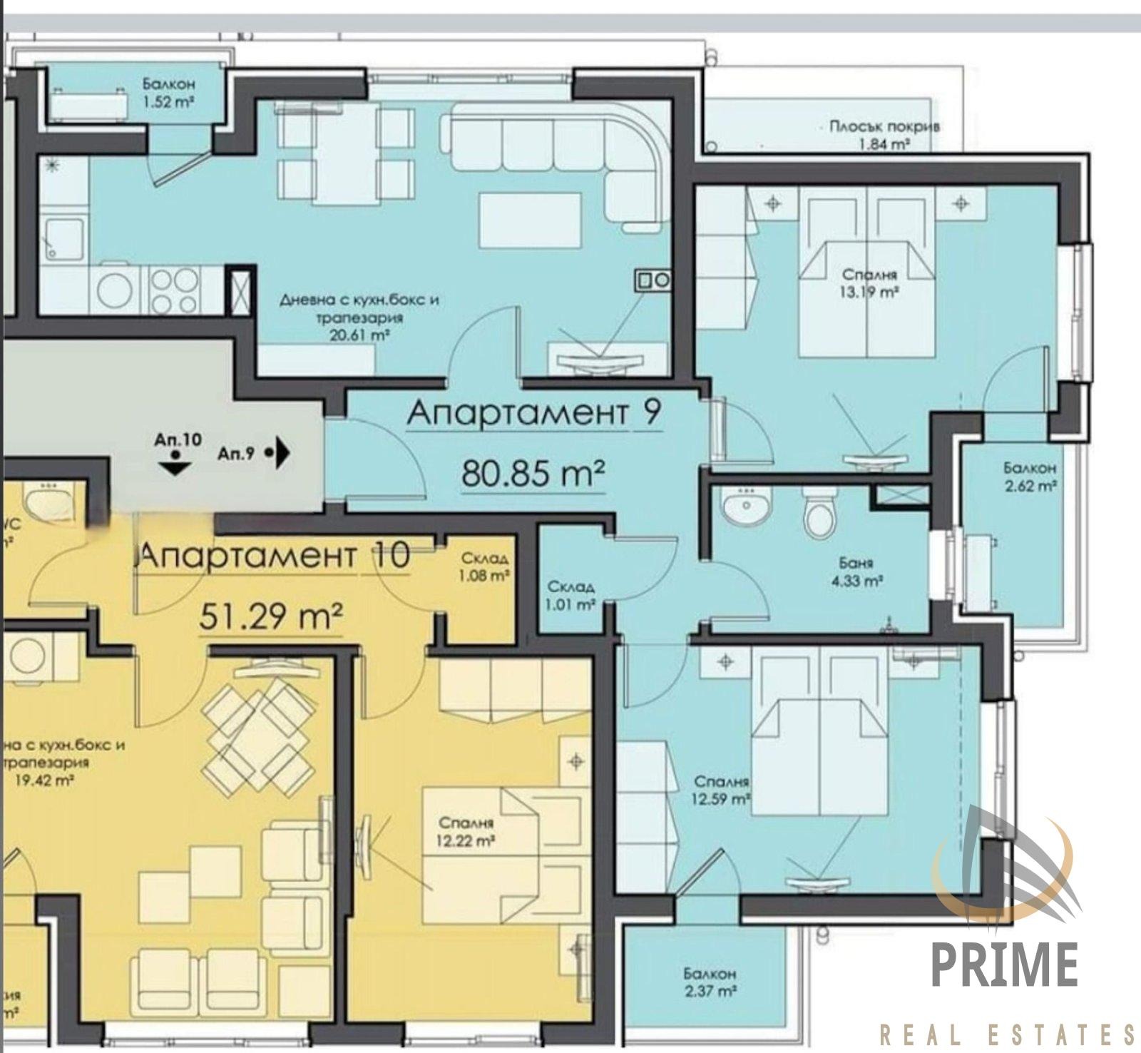 Апартамента се състои от коридор, кухня с трапезария и хол, две спални, складово помещение, баня с тоалетна и три тераса. Без преходи.