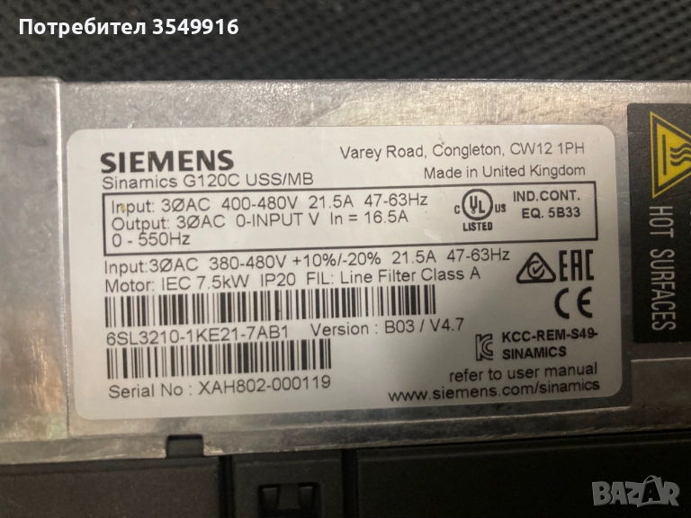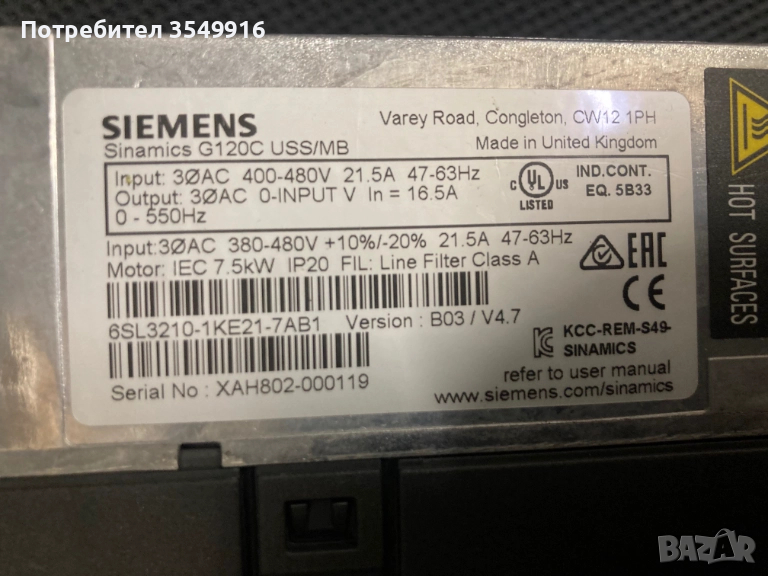 Честорен регулатор 7,5KW Модел SINAMICS G120C USS/MB Вход 1PH 400/480V 50/60Hz 21,5A Изход 3PH 0 - 480V 0,5/550Hz 16,5А