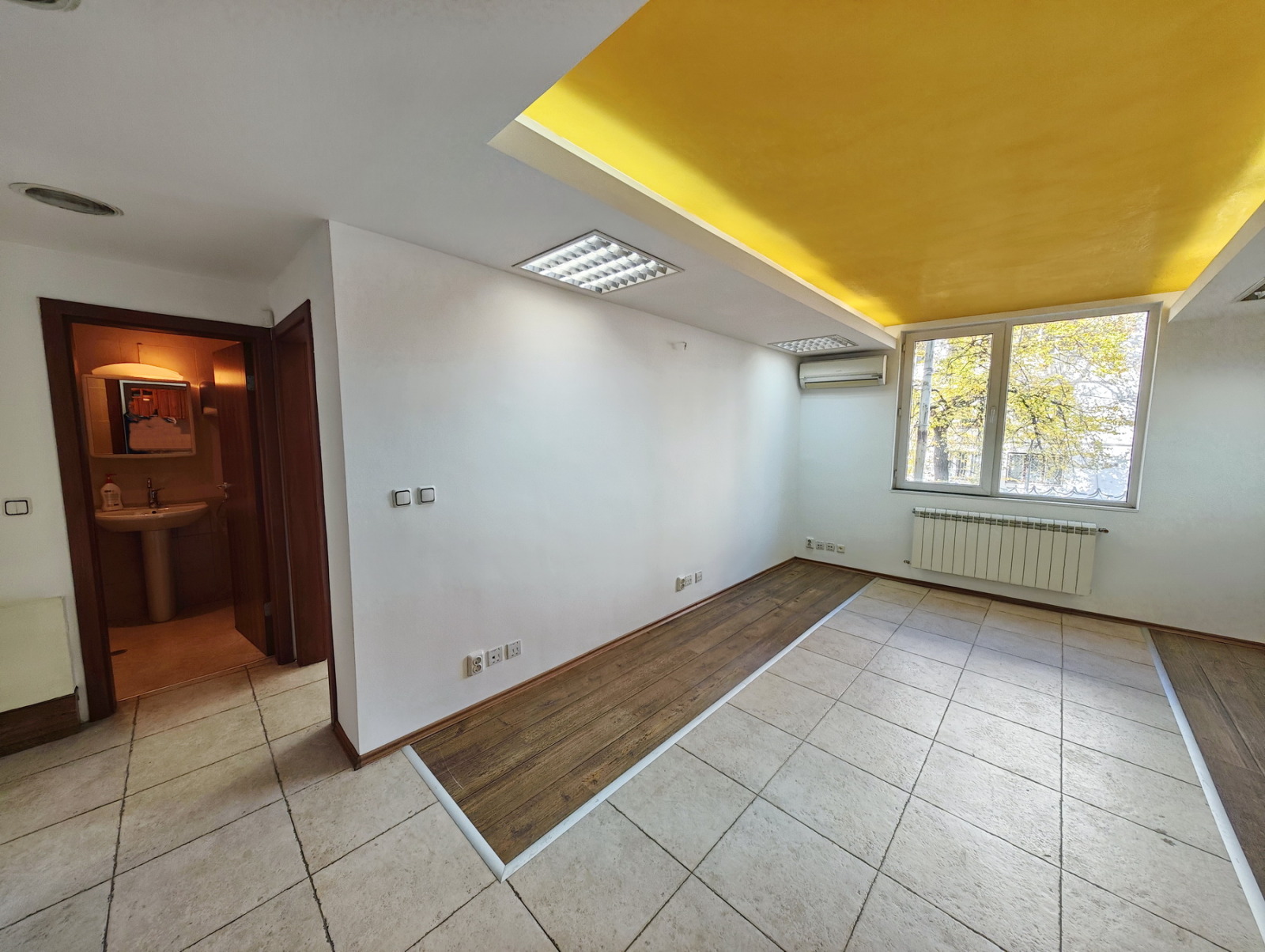 Три самостоятелни работни помещения (по 15 20 кв.м всяко) с ламинатна настилка в дървесен тон;