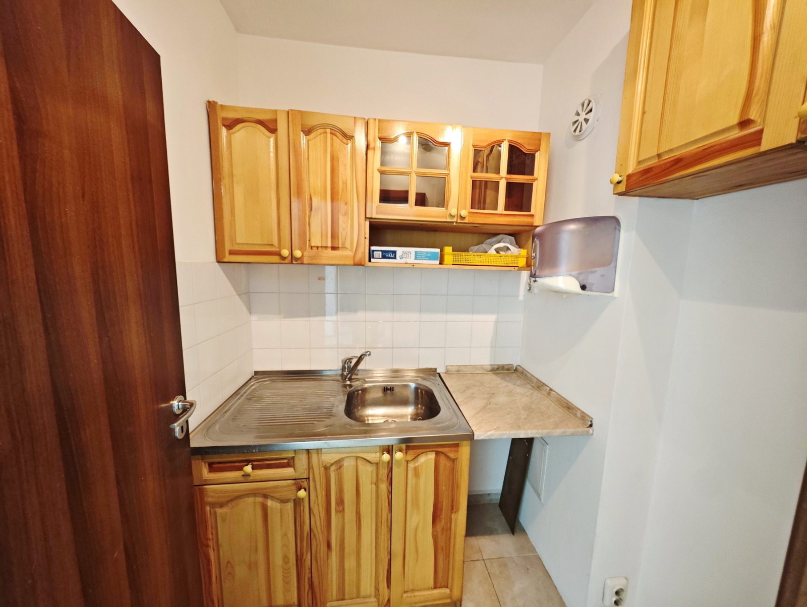 Малък кухненски бокс, обзаведен с горни и долни шкафове и мивка от неръждаема стомана.