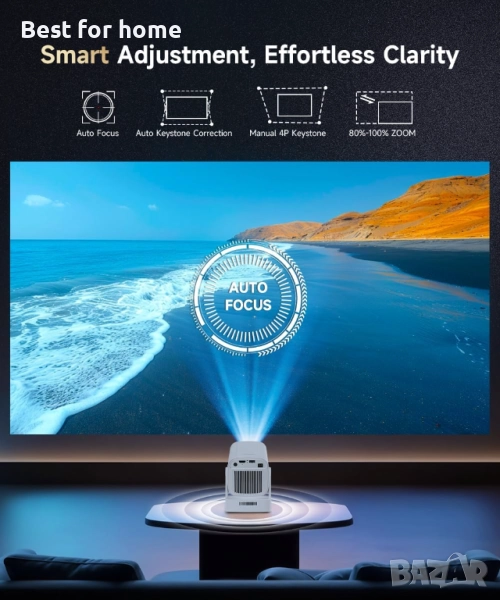 Автоматично фокусиране за незабавна яснота: Оборудван с автоматично фокусиране и автоматична вертикална корекция на трапецовидно изкривяване, този преносим проектор осигурява ясно, перфектно подравнено изображение всеки път. Независимо дали става въпрос за филмова вечер или за забавна анимационна сесия за деца, насладете се на перфектно ясна картина без нужда от ръчни настройки.