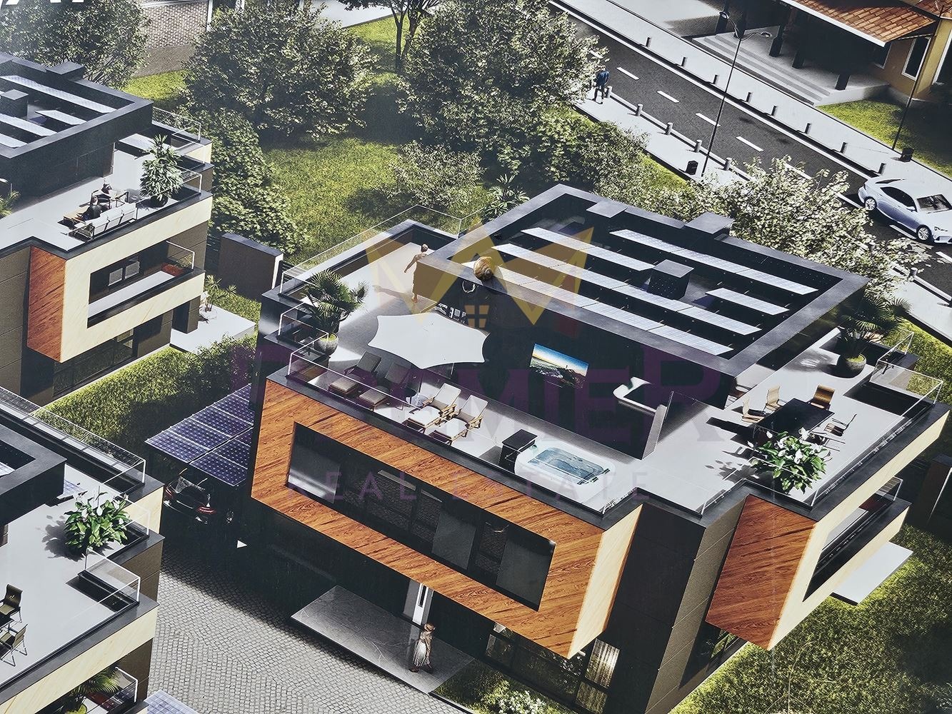 Къщата се намира в затворен комплекс, който се състои от четири еднофамилни къщи като към всяка има обособени самостоятелни дворни пространства от 500 кв.м.