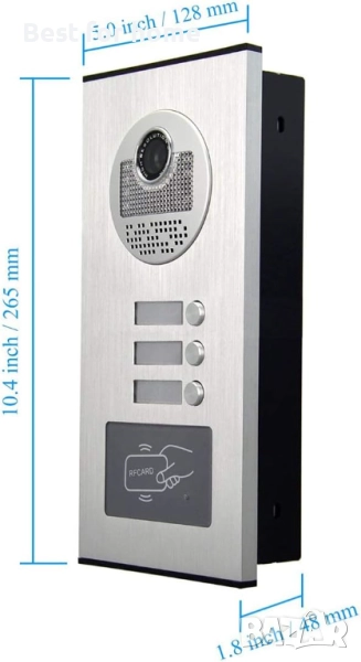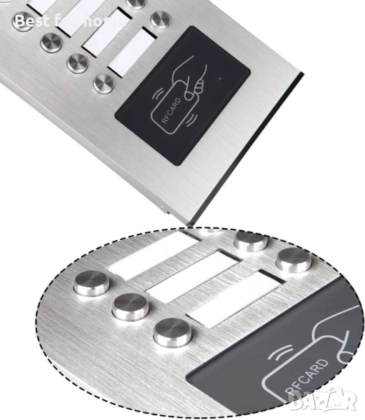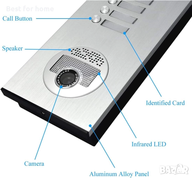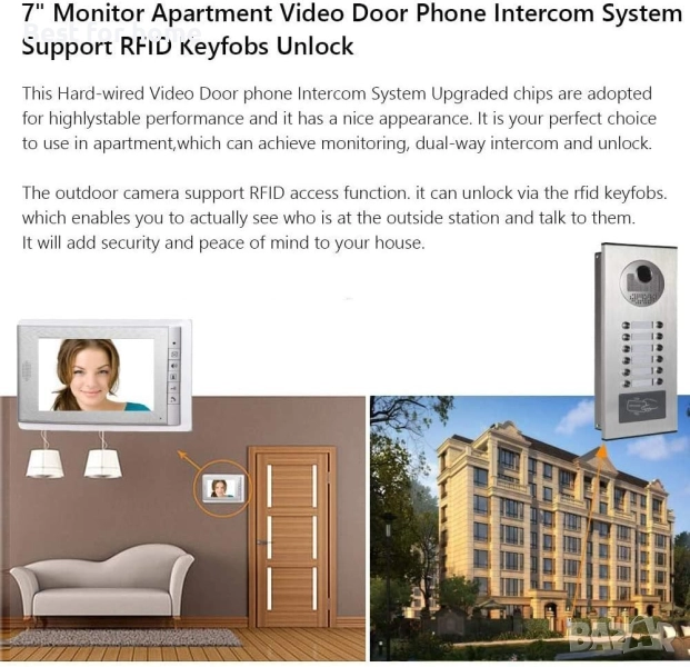 Външното устройство е оборудвано с 2-12 бутона за повикване, 700TVL камера и панел от чугунена алуминиева сплав. Вътрешният монитор има 7-инчов LCD цветен екран, който може да се използва от 2-12 независими домакински устройства.
