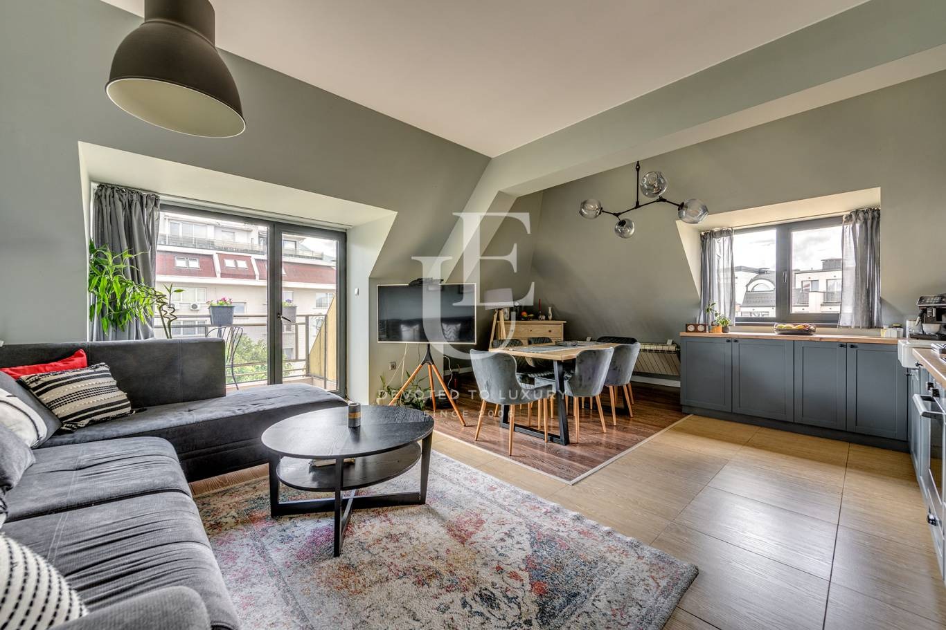Разпределението на апартамента е функционално без преходни помещения, и включва входно антре, дневна с кухненски бокс и трапезария, спалня с дрешник, детска стая, баня и две тераси. Едната тераса предлага гледка към града, а другата разкрива красива панорама към Витоша, което допълва усещането за връзка с околната среда.