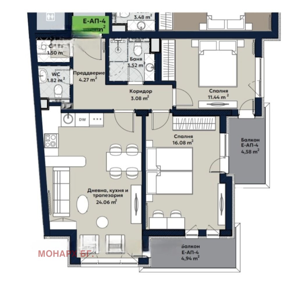 Агенция за недвижими имоти Монарх БГ Продава тристаен апартамент на втори етаж в бутикова секция на проекта включваща само девет имота в целия вход. Жилището се състои от антре мокро помещение, две непреходни спални, баня с WC, самостоятена тоалетна, всекидневна с трапезария, кухненски бокс и две панорамни тераси. Застроената площ е 89,68 кв.м.Изложение изток/североизток.