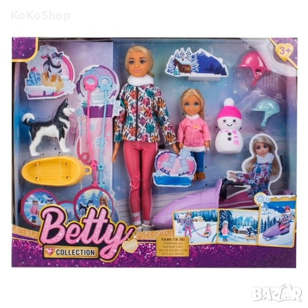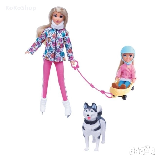 Страхотен комплект за игра,който съдържа прелестна кукла манекен с моторна шейна, облечена със ски екипировка. Включени са още кукла дете,куче,шейна,снежен човек и аксесоари.