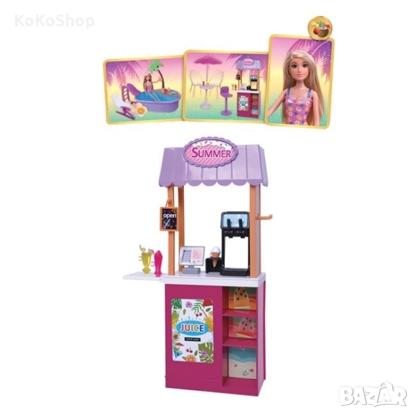 Красива кукла с бански костюми и шапка, в комплект с басейн, плажен бар, маса с два стола и чадър, шезлонг и аксесоари. Детайлно изработен,този комплект ще накара детето Ви да се забавлява часове наред.