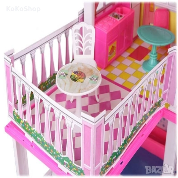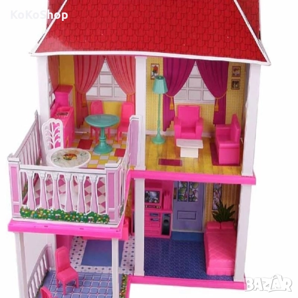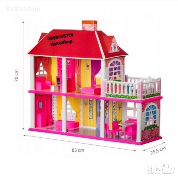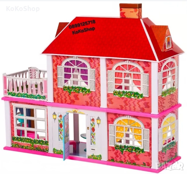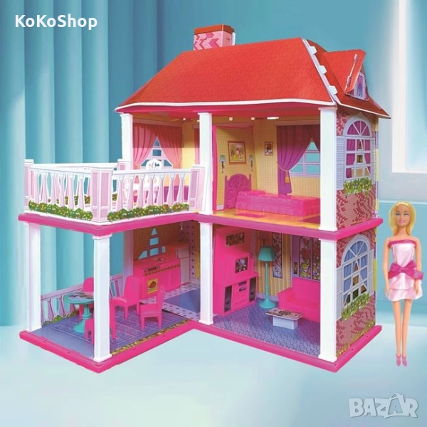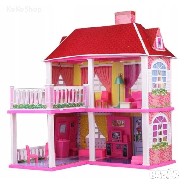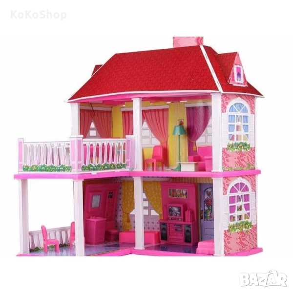 къща за кукли на два етажа,с вътрешен двор и голяма веранда. Има обзавеждане във всяка стая, многоцветни тапети и подове и врата, която се отваря и затваря.