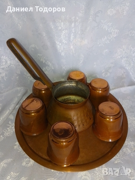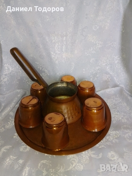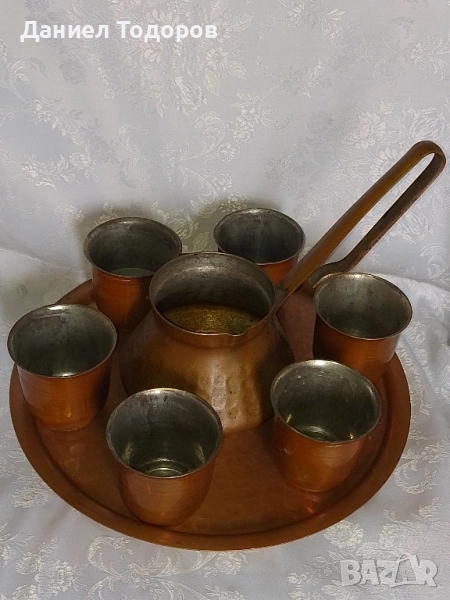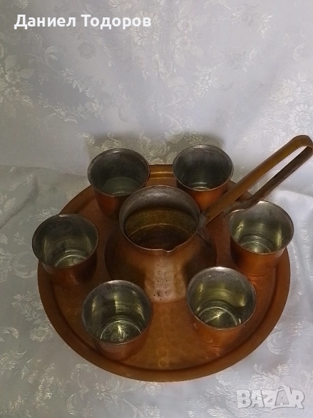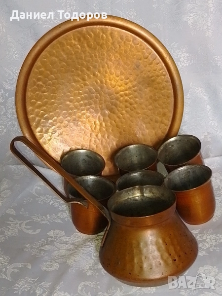 Стар Меден Сервиз за - Кафе , Вино, Ракия - 8 части 1Джезве, 6 бр.Чаши, 1 Голям Поднос, Размери -Джезве - височина - 9 см. , диаметър - 8 и 12 см. - в основата , дръжка - 18 см.Чаши - 6,5 х 6,5 см. Голям Поднос - диаметър - 27см. Доставка с -10% по Еконт или Спиди,с опция Преглед. Моля при поръчка изпратете 2 имена телефон и адрес на офис или ваш адрес.