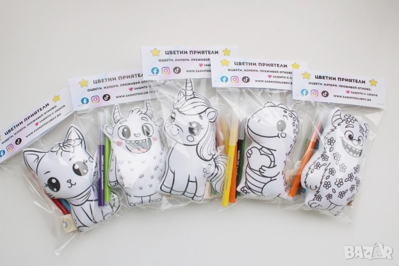 🎨💛 Цветни приятели — нарисувай, изпери, обичай отново! Всеки нов герой е роден с много мисъл, любов и грижа — за децата и за природата. 🌱 Когато създавам играчка, си представям детските ръчички, усмивките и въодушевлението в очите. Искам тя да носи не просто забавление, а смисъл и преживяване. Нашите Цветни приятели са специални — можеш да ги оцветиш сам, да ги изпереш в пералня и... да започнеш отначало! ♻️ 🎨 Флумастрите са без глутен, нетоксични и дерматологично тествани — напълно безопасни за малките творци. 💧 Играчките са миещи се и сушилнята не им пречи — готови са за нови приключения отново и отново. Защото вярвам, че една рисунка може да оживее, че въображението е най-чистата форма на щастие, и че всяко дете заслужава своя цветен приятел. 🌈 Размер на цветно приятелче : 16 см Цена за 1 брой: 15.99 лв Всяко приятелче пристига с 4 цветни флумастера – специално подбрани да му подхождат! 🎁 Специално предложение! Можеш да поръчаш три Цветни приятелчета в комплект с цяла кутия оригинални перяеми флумастери само за 39.99 лв! 🌈