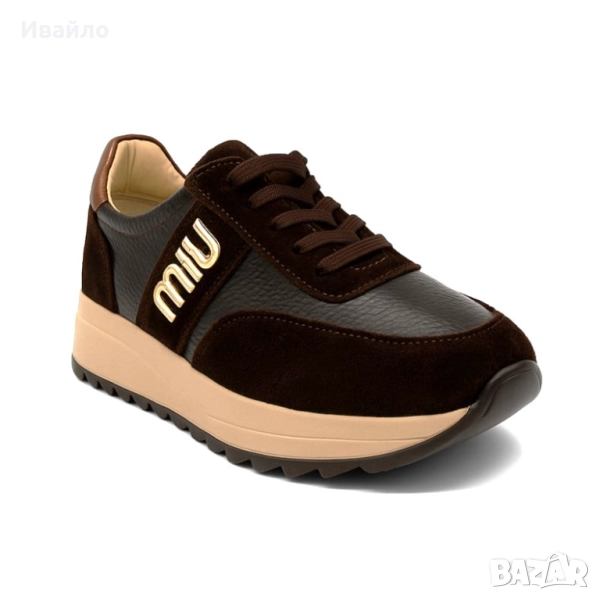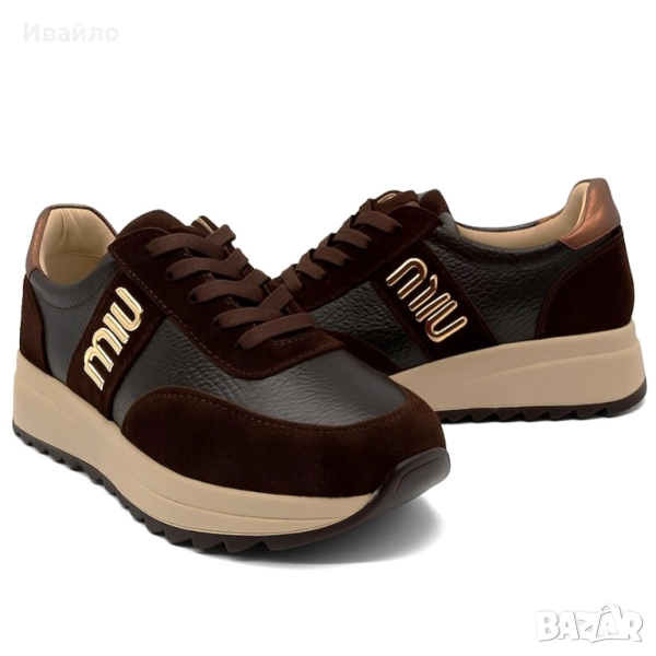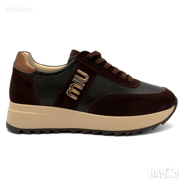 Луксозни и удобни – тези дамски сникърси в стил "MIU" са изработени от висококачествена естествена кожа в наситен кафяв цвят, съчетан с бежова платформа и златисто лого от външната страна. Уникалната комбинация от текстури придава дълбочина и характер на модела.