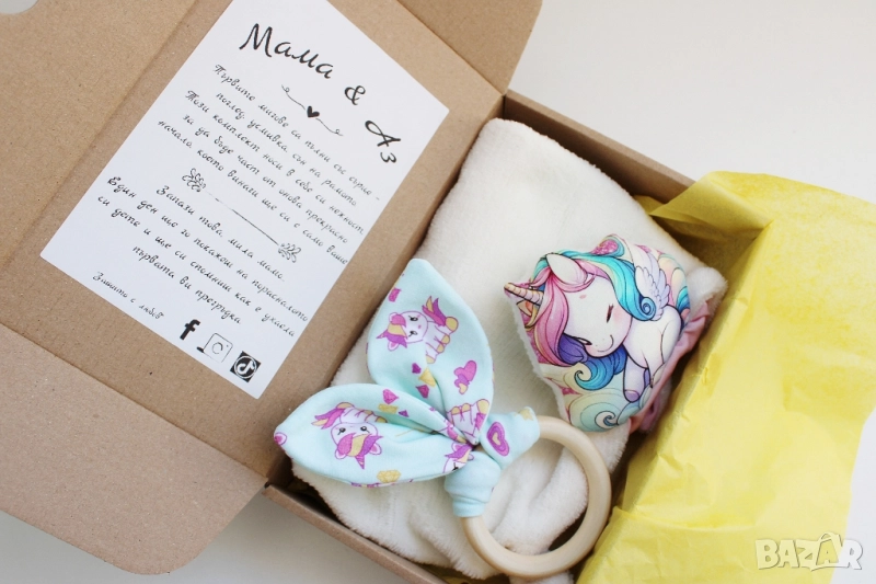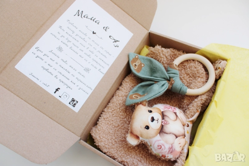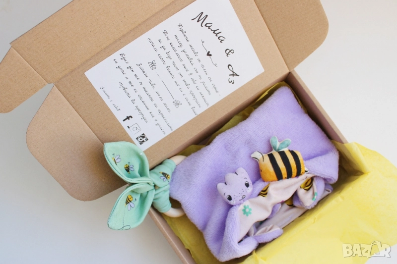 ✨ Мама & Аз – комплект, създаден със сърце 💛 Прекрасен избор за подарък при появата на нов живот, за кръщене или просто като мил жест към една прегръдка между майка и дете. Всяка кутия носи усещане за топлина, грижа и спомен – от първата усмивка до най-сладкото гушкане. Нежни материи, бебешки цветове и любов, зашита във всеки шев. 🎁 Поднесено красиво, запомнящо се – и завинаги свързано с най-нежната връзка. 📦 Размер на кърпичката: 30 х 30 см ⭕ Диаметър на гризалката: 5 см 💰 Цена на комплект: 34.99 лв. 🔹 5 тематични кутии с послание към мама 💌 Пиши ми за поръчка или въпроси