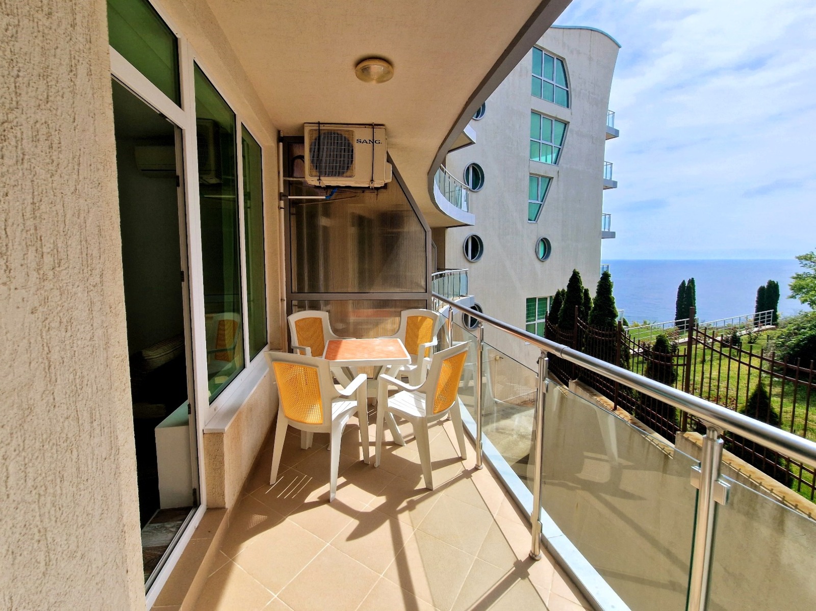 Прозорците и терасата гледат към тихата част на комплекса, давайки отлична възможност да се насладите на морската гледка в тишина.