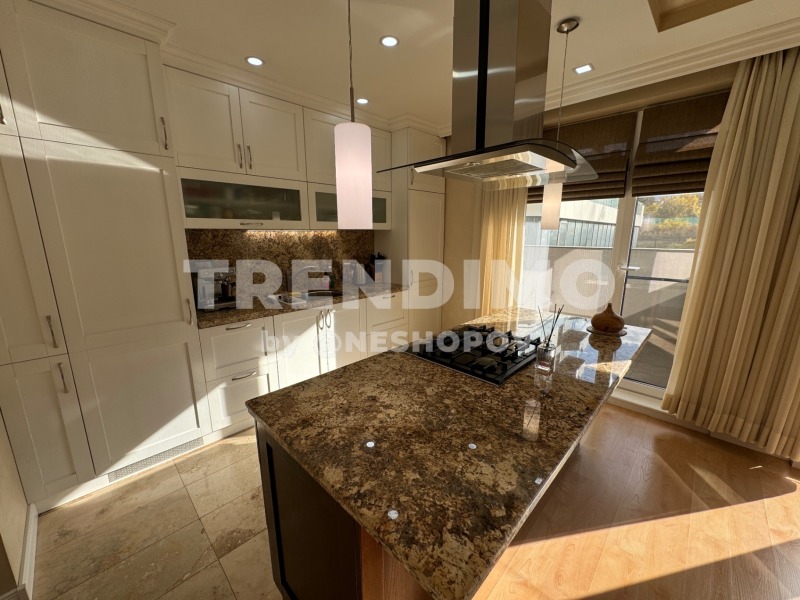 Кухнята е изцяло облицована с гранит и оборудвана с висок клас вградени уреди Bosch, абсорбатор Elica, както и отделен хладилник и фризер.