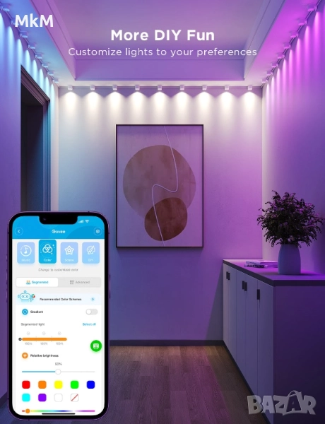 Вдъхновете се с режим „Направи си сам“: С помощта на приложението Govee Home можете да избирате от милиони цветове, да регулирате яркостта и др.