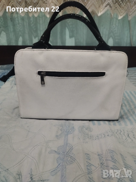 Черно - бяла дамска чанта, подходяща за повод или ежедневие. С две големи отделения и трето по средата с цип. Има и дълга дръжка. Размери д. 32 см, в. 22см, ш. 11см.