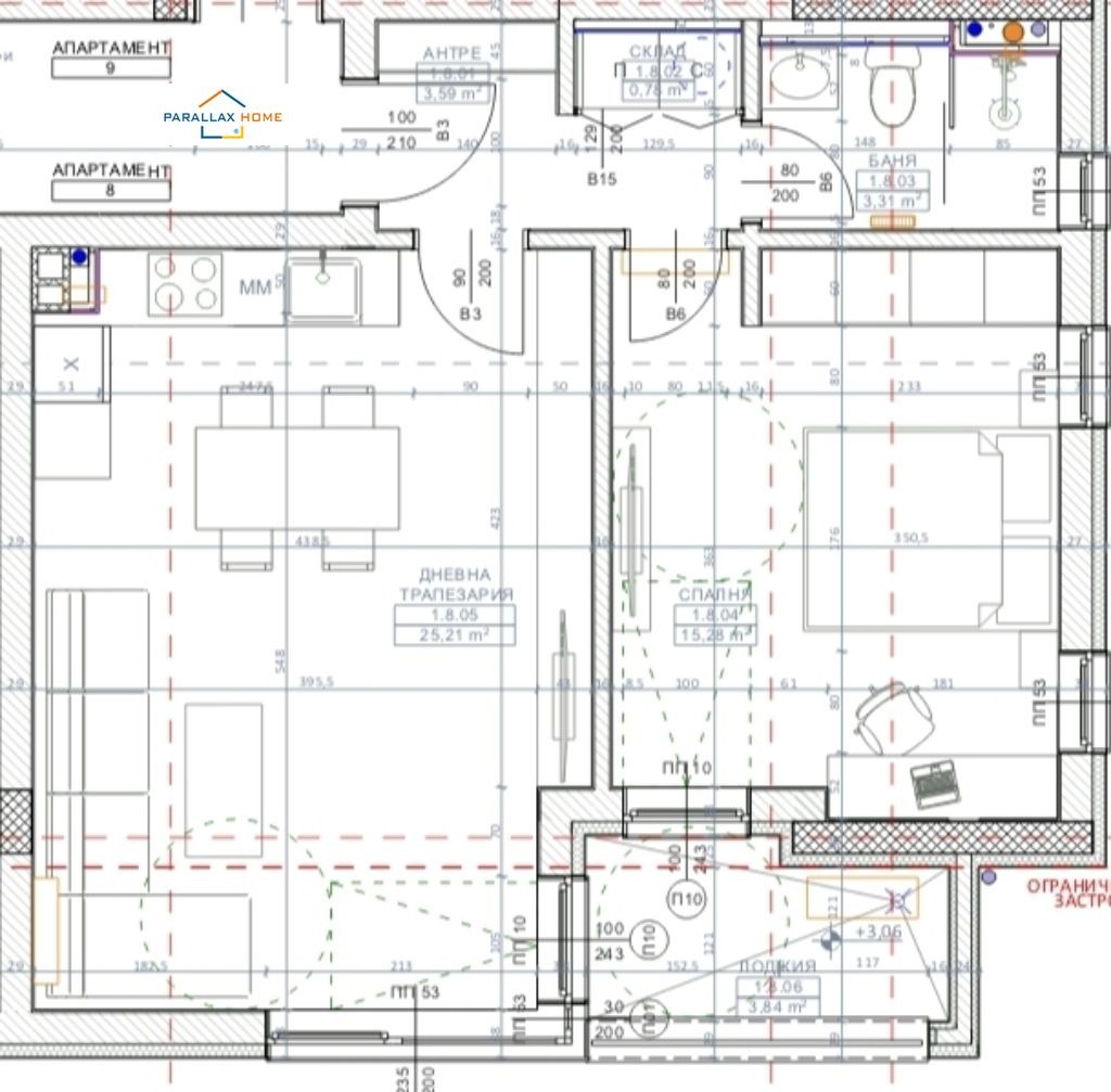 Предлаганият апартамент (ап. 8) е със застроена площ 64,97 кв.м и обща площ 76,64 кв.м.