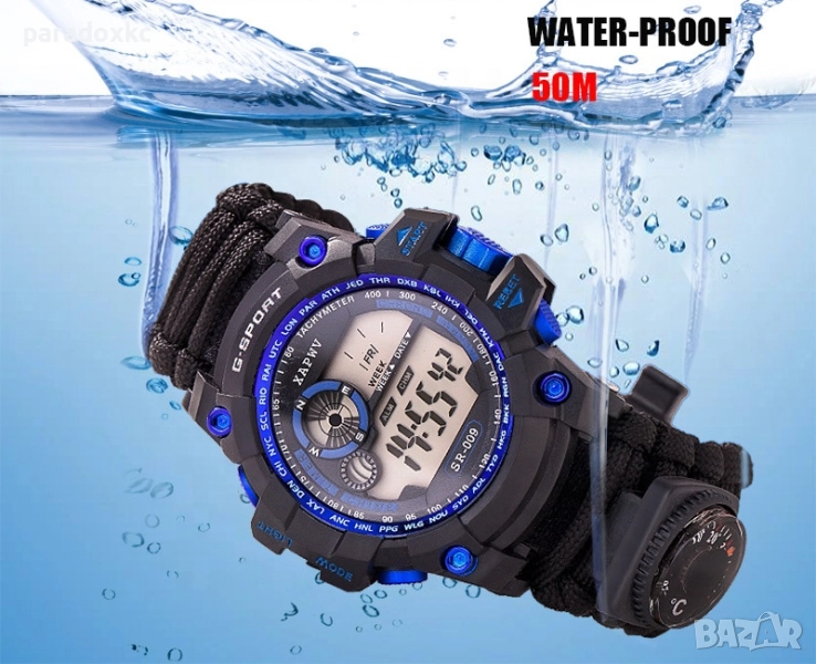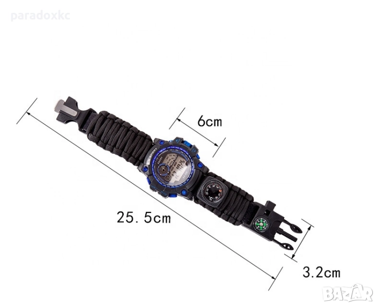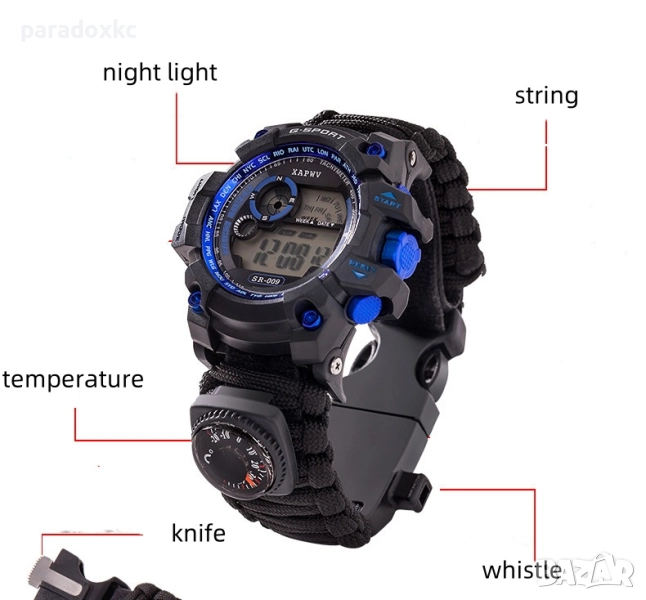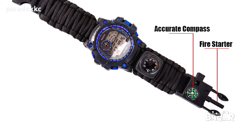 Функции: Паракорд гривна, компас, кремък/огниво, LED подсветка, двойно показване (аналог + цифров), аларма, хронометър