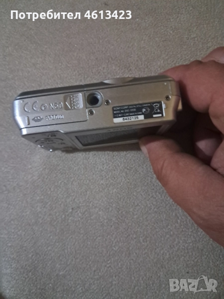 Фотоапарата е много запазен с минимални следи от употреба и в отлично визуално и техническо състояние. Работи с два броя батерии Тип АА 1,2 V. Продава се без батерии. Характеристики: Максимална резолюция3648 x 2736Ефективни пиксели10 мегапикселаРазмер на сензора1/2,3" (6,17 x 4,55 мм)Тип сензорCCDISOАвтоматично, 100, 200, 400, 800, 1600, 3200Фокусно разстояние (екв.)38–108 ммМаксимална блендаF2.9–5.4Съчленен LCD дисплейФиксираноРазмер на екрана2,4 ″Точки на екрана112 300Максимална скорост на затвора1/2000 секФорматMotion JPEGВидове съхранениеMemory Stick Duo / Pro Duo / PRo-HG Duo, вътрешнаТегло (вкл. батерии)167 г (0,37 фунта / 5,89 унции )Размери90 x 61 x 26 мм (3,54 x 2,4 x 1,02 инча ). Изпраща се задължително с преглед и тест.