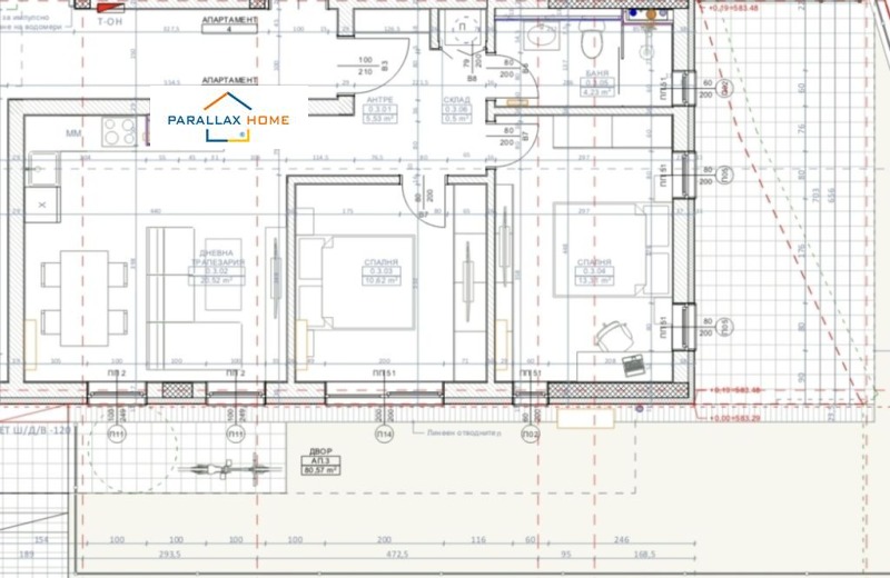 Предлаганият апартамент (ап. 3) е със застроена площ 67,82 кв.м и обща площ 80,57 кв.м.