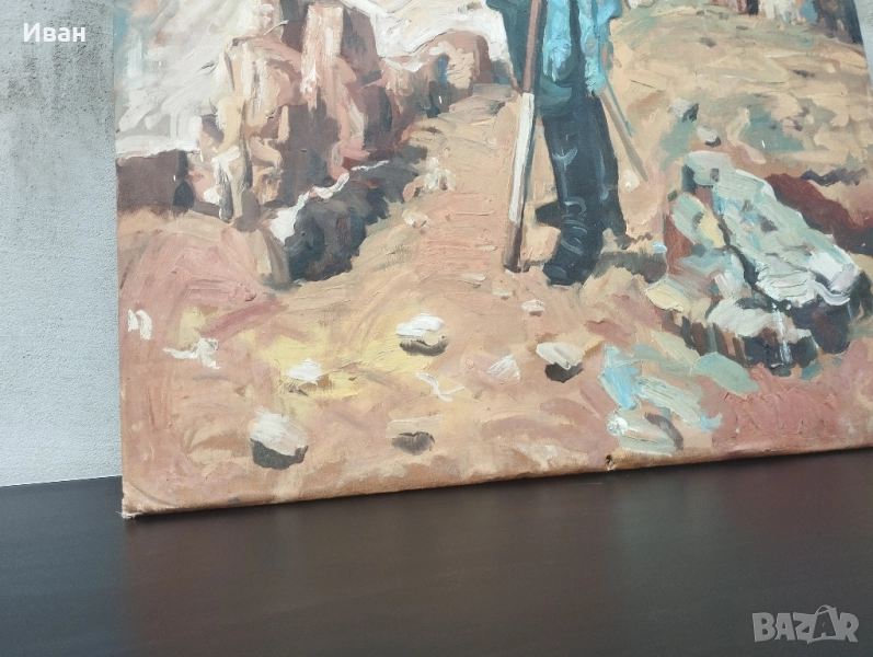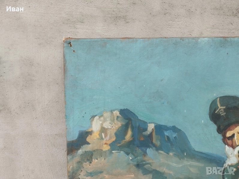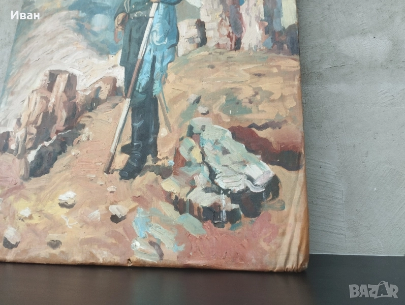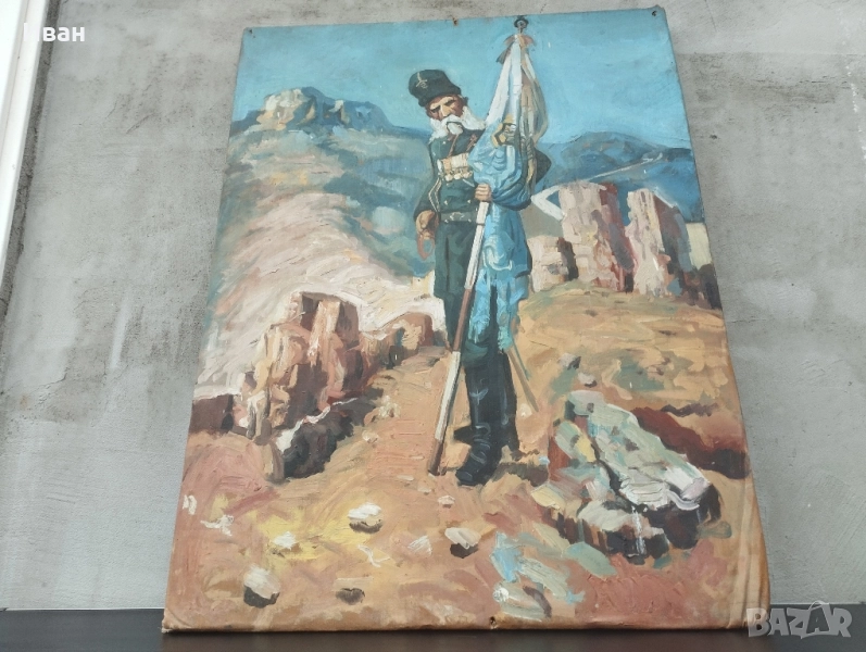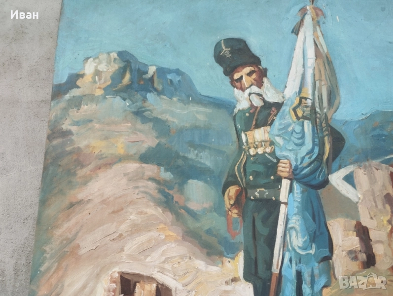 знаме . Размери -81/60 см Платно опънати на дървена рамка . Картината е била прикрепена през рамката към стената . Забележките се виждат . Картината изобразява Никола Корчев, български опълченец, известен като спасителя на Самарското знаме. Той е бил последният знаменосец на знамето. Никола Корчев е роден през 1836 г. в село Горна Диканя, Радомирско. Той е бил локомотивен машинист и емигрира в Румъния, където се присъединява към българските емигранти. По време на Руско-турската война от 1877-1878 г. Корчев се включва в опълчението. Картината, често наричана "Самарското знаме", е дело на чешкия художник Ярослав Вешин.