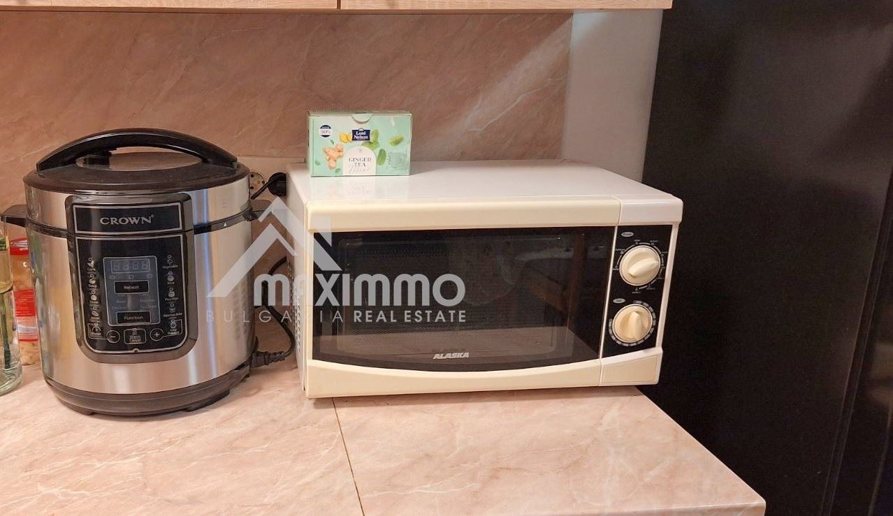 Предлага се напълно обзаведен, с всички нужни удобства за живеене и комфорт! Дневна с вградена кухня, маса столове, разтегателен диван. Спaлня с двойно легло, гардероб, тоалетка. Климатик, пералня, хладилник, печка, котлони, микровълнова, мултикукър, бойлер.